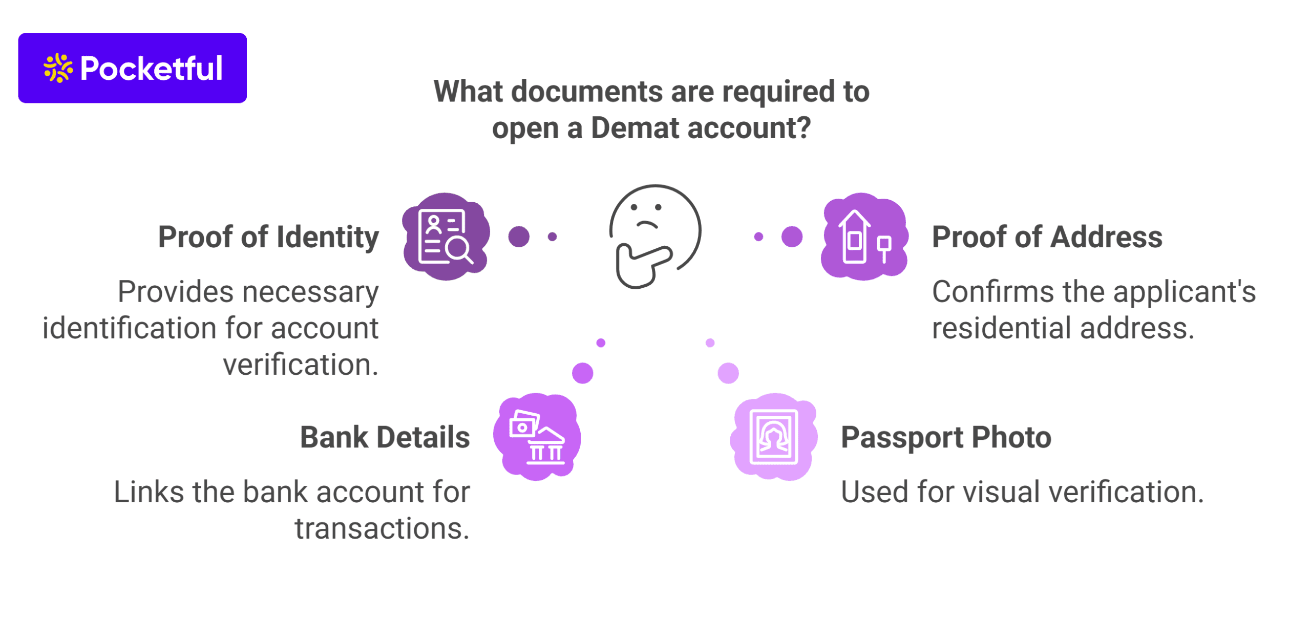 To open a Demat account, you need:1. Proof of identity (PAN card (mandatory), Aadhaar card, passport, and voter ID)2. Proof of Address (Aadhaar card, utility bills, and bank statement)3. Bank Details (canceled cheque or bank passbook)4. Income Proof (for derivatives trading)5. Passport sized photograph