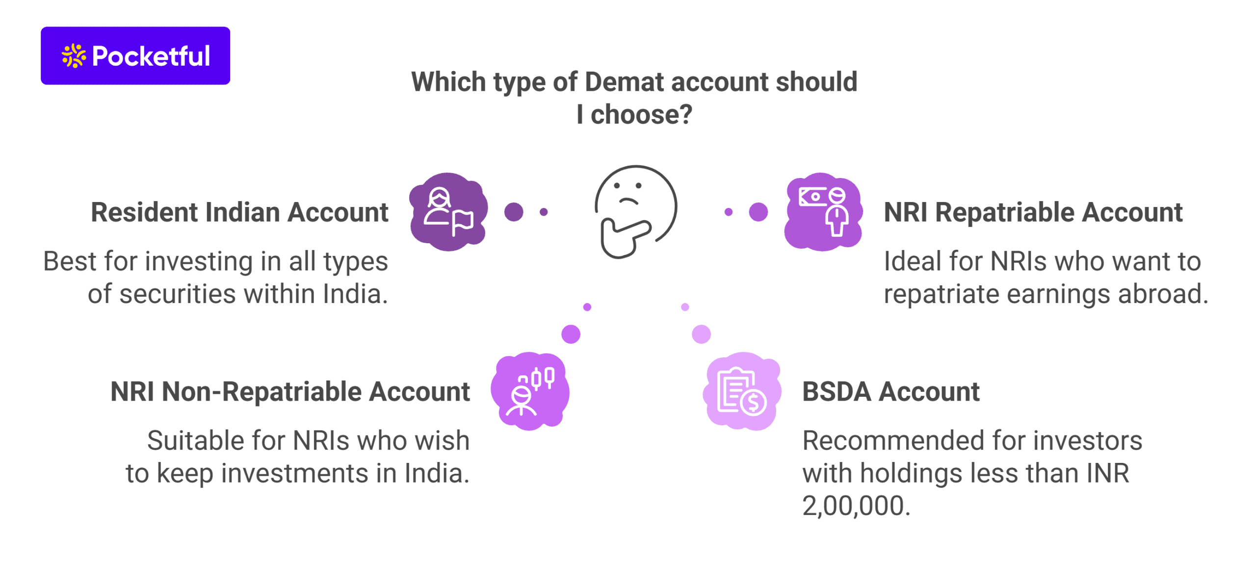 For Resident Indians: As a resident Indian, the regular Demat account is the best option as it allows you to invest in all types of securities. An investor can opt for a BSDA if the value of investment holdings is less than INR 2,00,000.