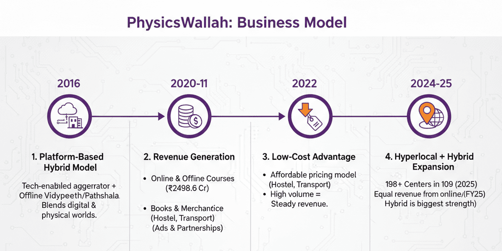 PW, despite being the owner of the coaching center itself, acts as a tech-enabled aggregator. Millions of students study on the online app and website, while teachers take classes directly in offline Vidyapeeth and Pathshala centers. In this way, the company has created a reliable model by combining both the digital and physical worlds.