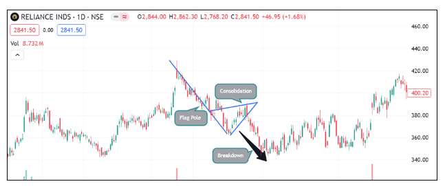 We have an example of Reliance Industries on technical charts showcasing bullish and bearish pennant patterns.